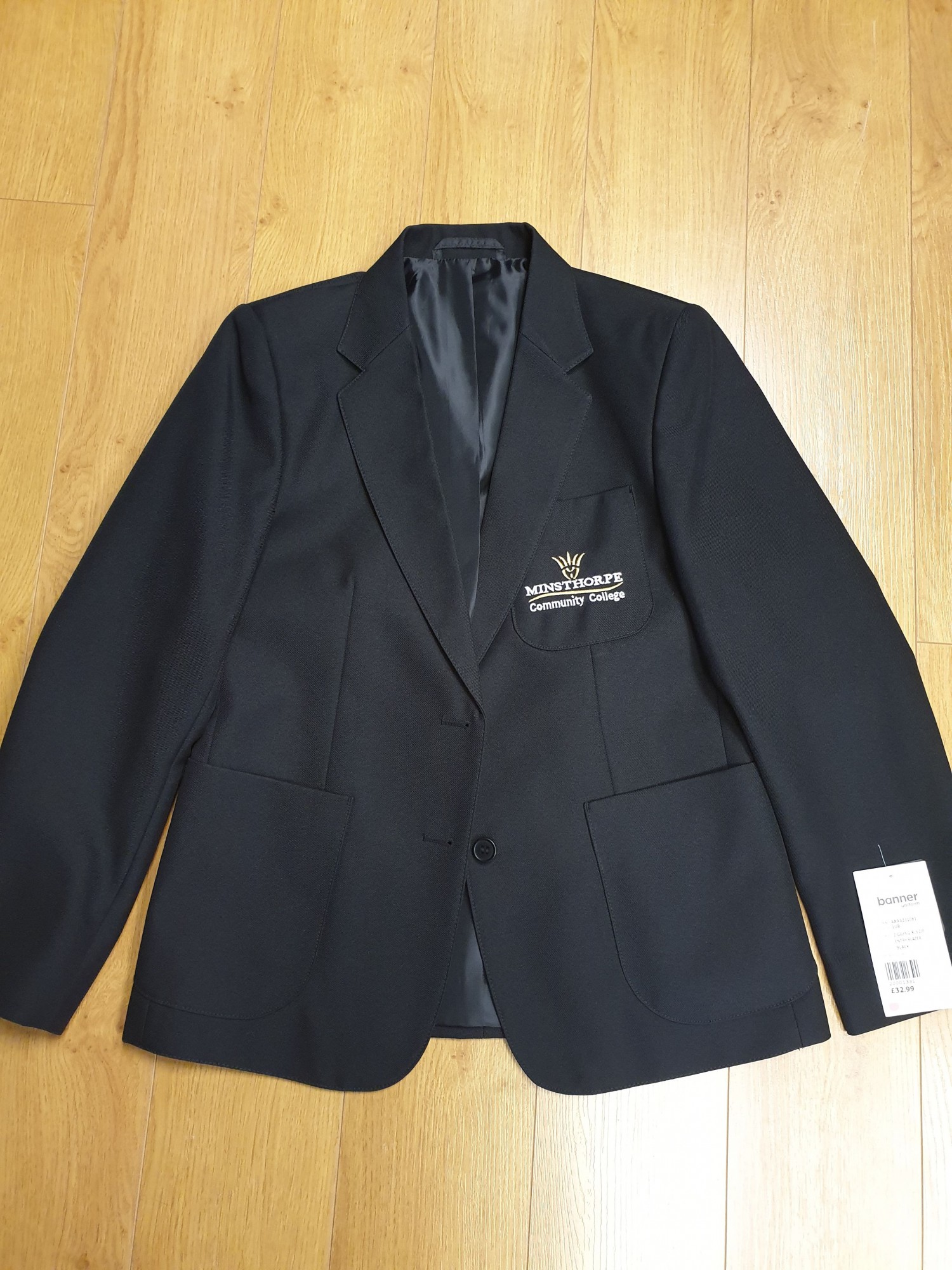 MINSTHORPE COMMUNITY COLLEGE GIRLS BLAZER BLACK WITH EMBROIDERED LOGO THE BLAZER COMES WITH 2 FRONT POCKETS, CHEST POCKET ALONG WITH ZIP INTERNAL POCKET AND SECURE POCKET FROM SIZES 28 INCH CHEST TO 52" CHEST